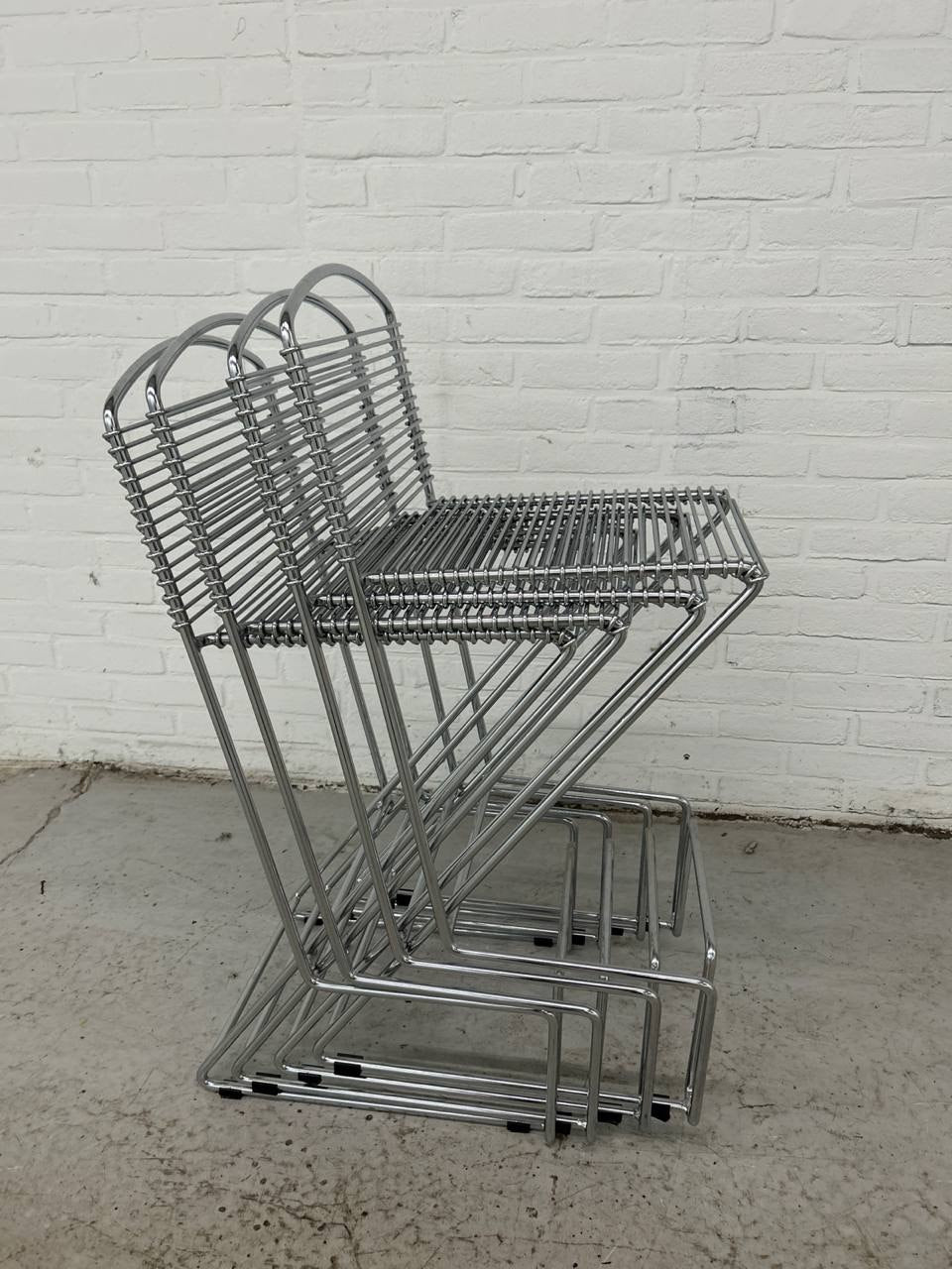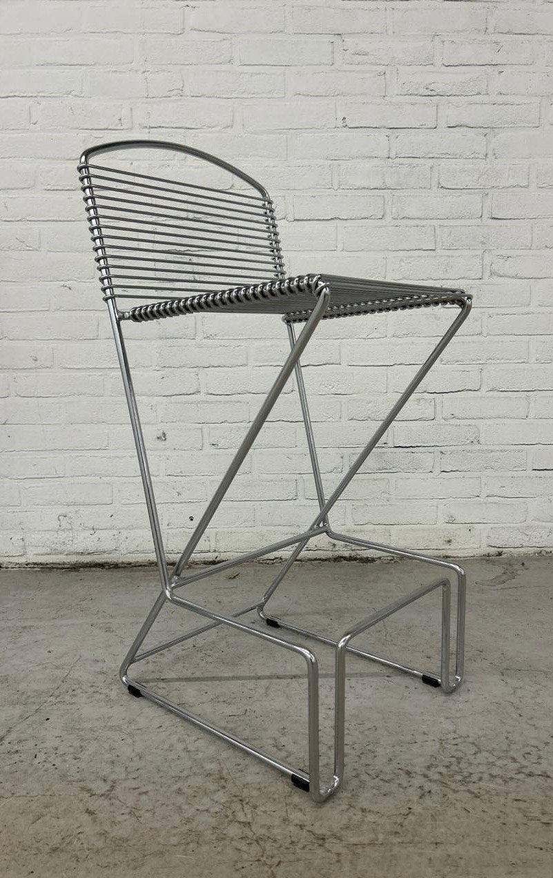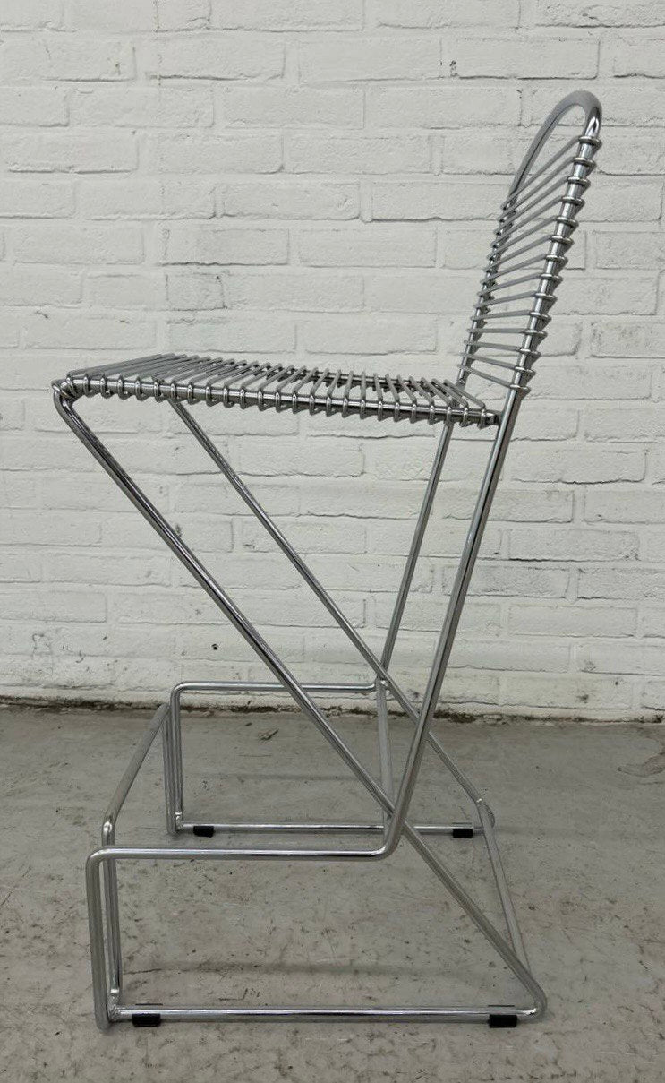 4 Vintage Postmodern bar stools / draadkruk. Set van 4 stapelbare design barkrukken. Deze zijn gemaakt van verchroomd metaal.