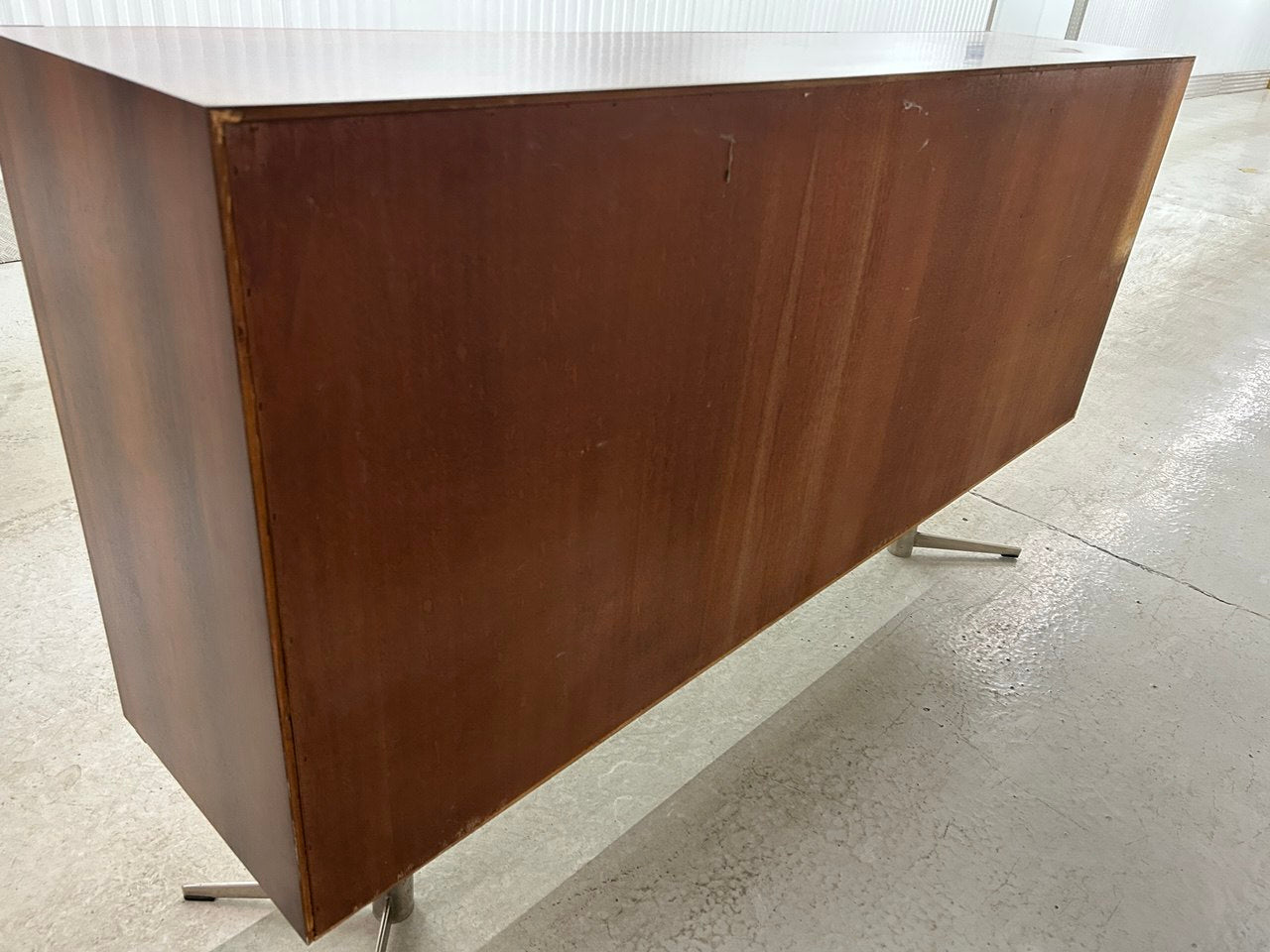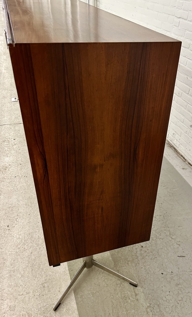Dressoir met bar, ontworpen door Louis van Teeffelen en geproduceerd door WeBe, jaren ‘60. Deze kast is afgewerkt in palissanderhout met een origineel geometrisch metalen/chroom onderstel. Een zeer modernistisch ontwerp.