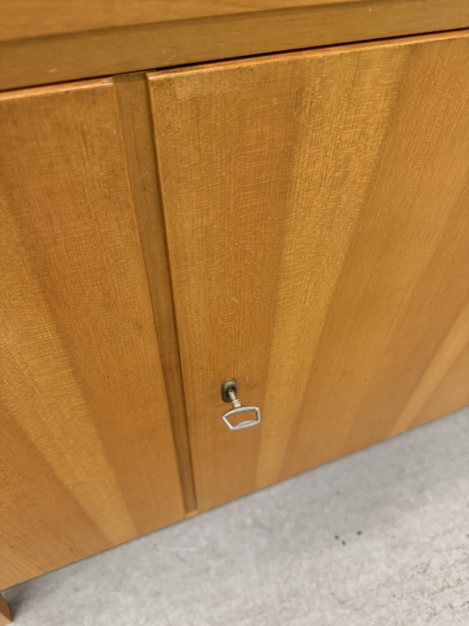 Vintage midcentury design dressoir. Dit meubel is een echte retro eyecatcher. Een sideboard met 5 lades en deurtjes die op slot kunnen. Beide sleutels zijn aanwezig. Deze kast heeft normale sporen van gebruik die passen bij de leeftijd (zie foto’s). Het betreft tweedehands goederen welke voor verkoop geïnspecteerd kunnen worden.