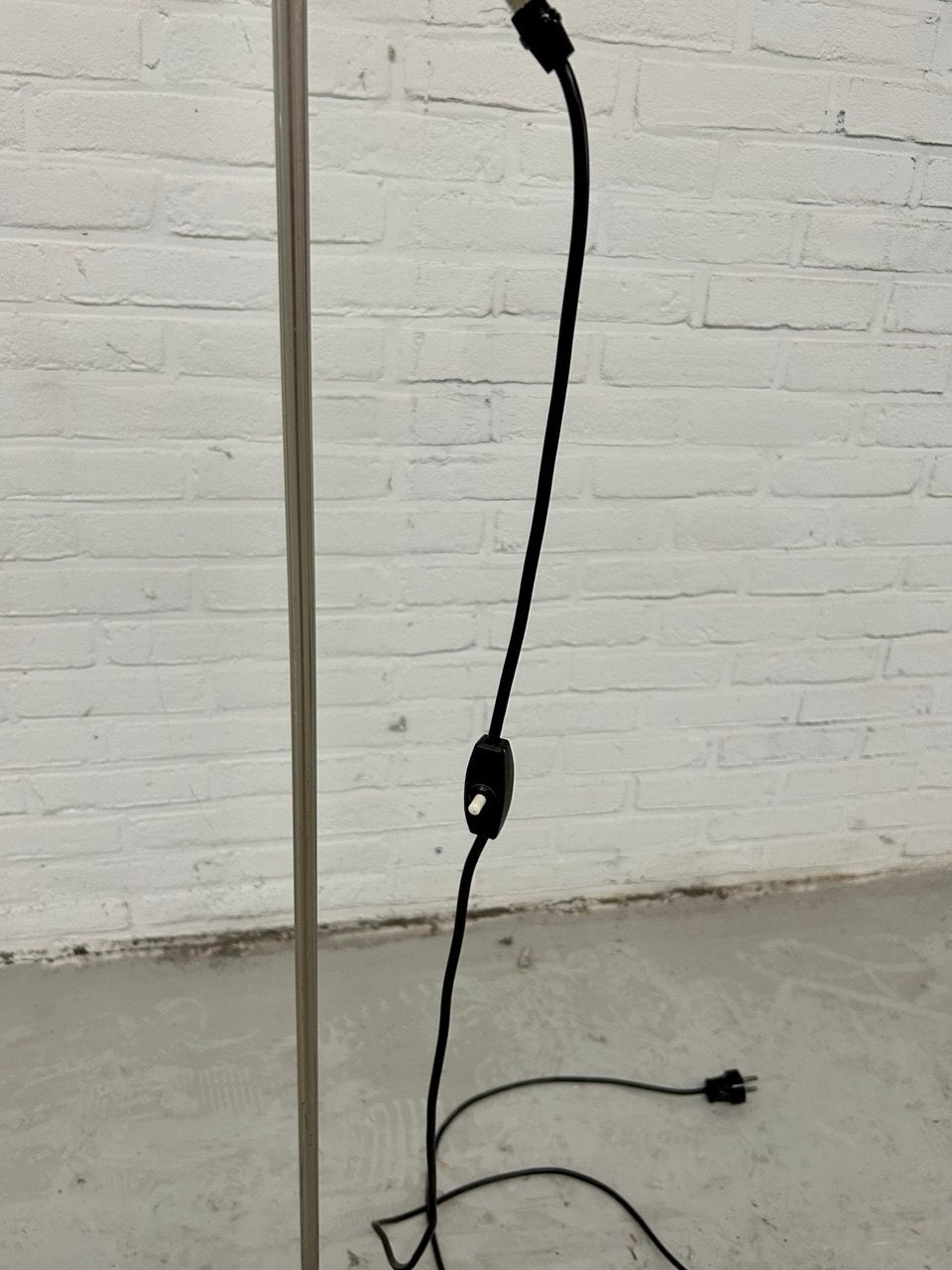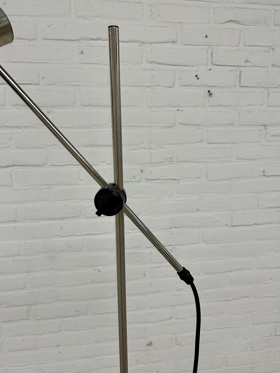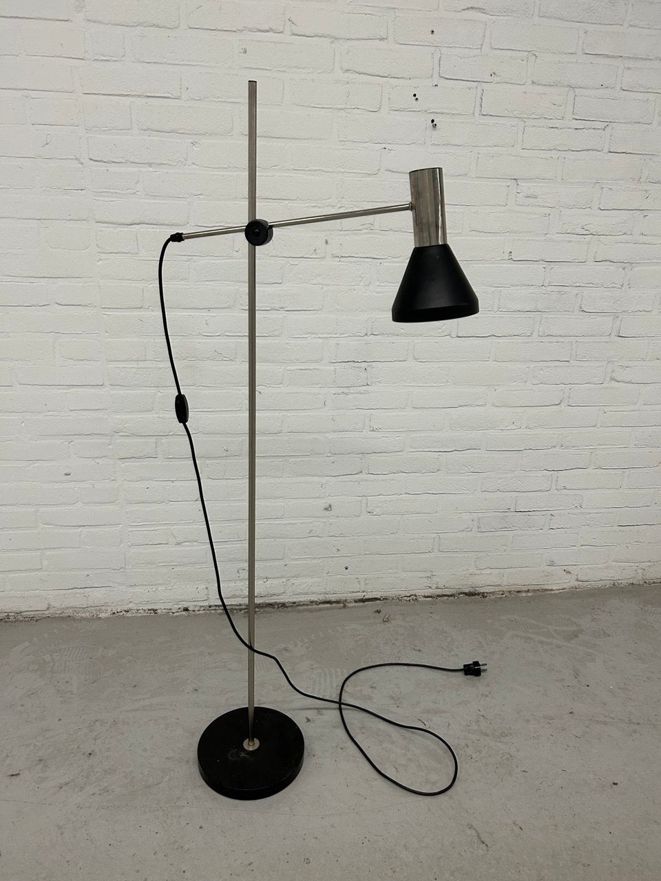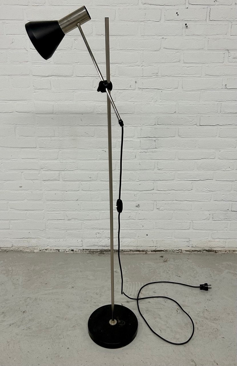Retro vloerlamp. Dit model wordt ook wel een hengellamp genoemd. Uitgevoerd in zwart met metaal. Kantelbaar en in hoogte verstelbaar. Deze midcentury lichtbron heeft een maximale hoogte van 165 cm. Het betreft tweedehands goederen welke voor verkoop geïnspecteerd kunnen worden.