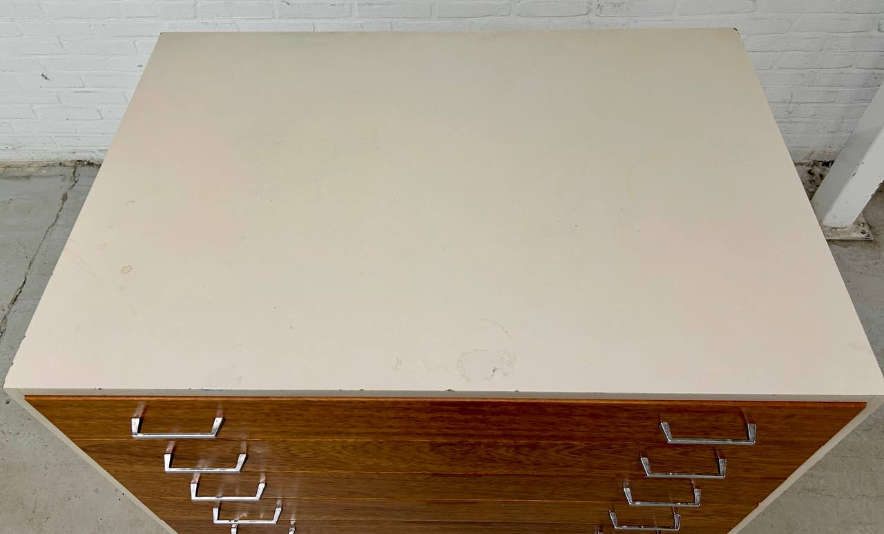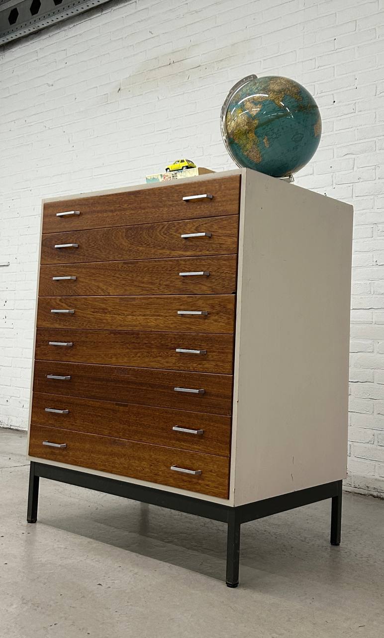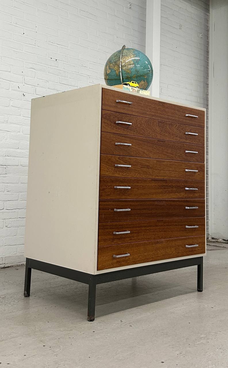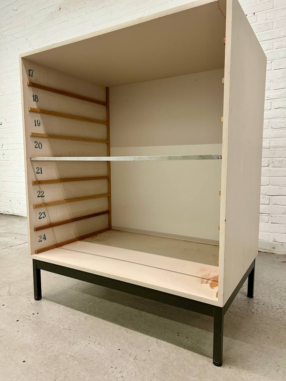 Originele vintage papierkast /ladekast afkomstig uit een school. Deze unieke schoolkast is voorzien van maar liefst 8 diepe lades. Ideaal om je papierwerk in op te bergen. Ook bruikbaar als knutselkast of archiefkast. Deze retro industriële kast komt uit een voormalige basisschool waarbij hij gebruikt werd als tekenladenkast. Gezien de leeftijd in goede vintage staat. Het betreft tweedehands goederen welke voor verkoop geïnspecteerd kunnen worden.