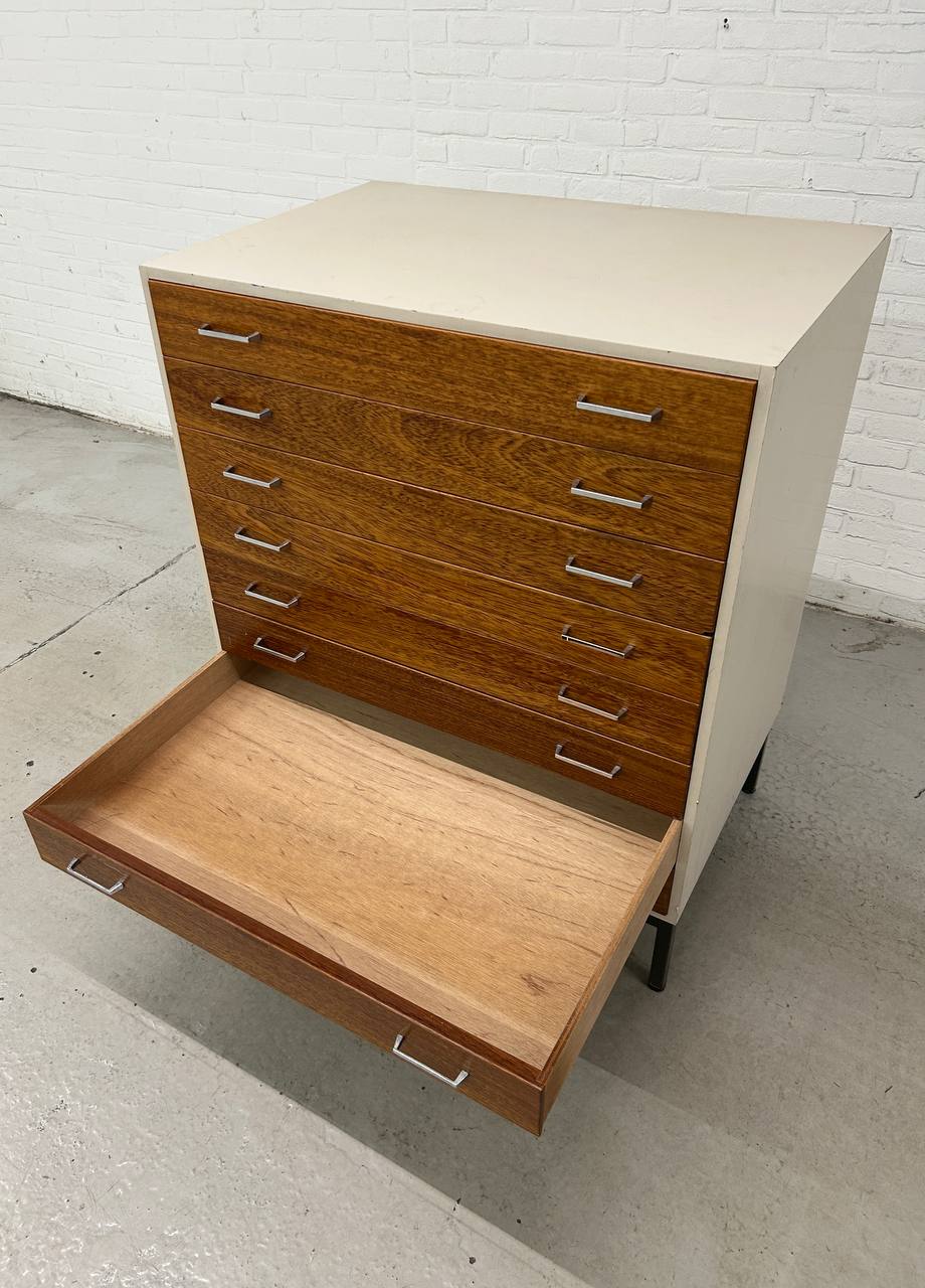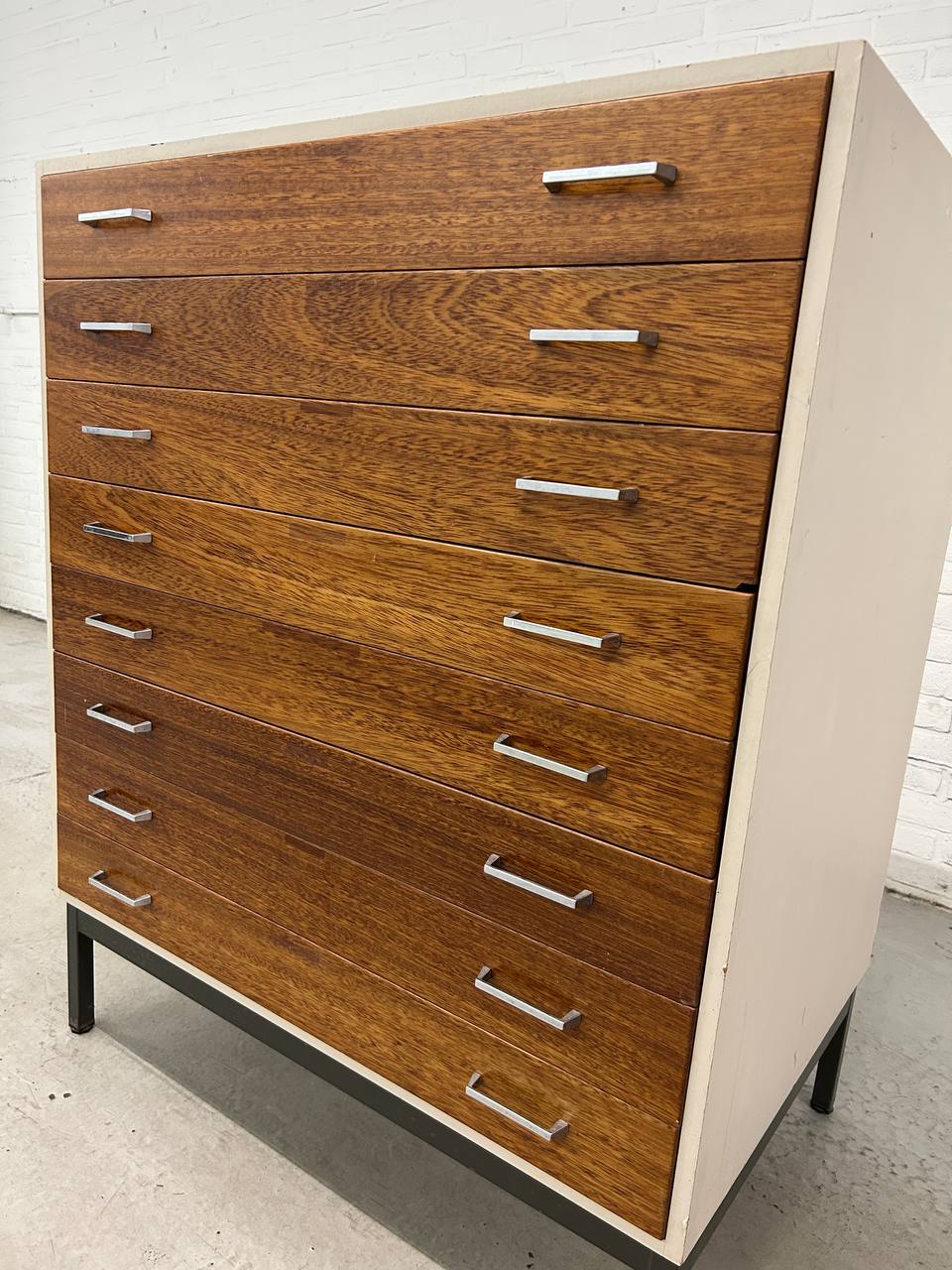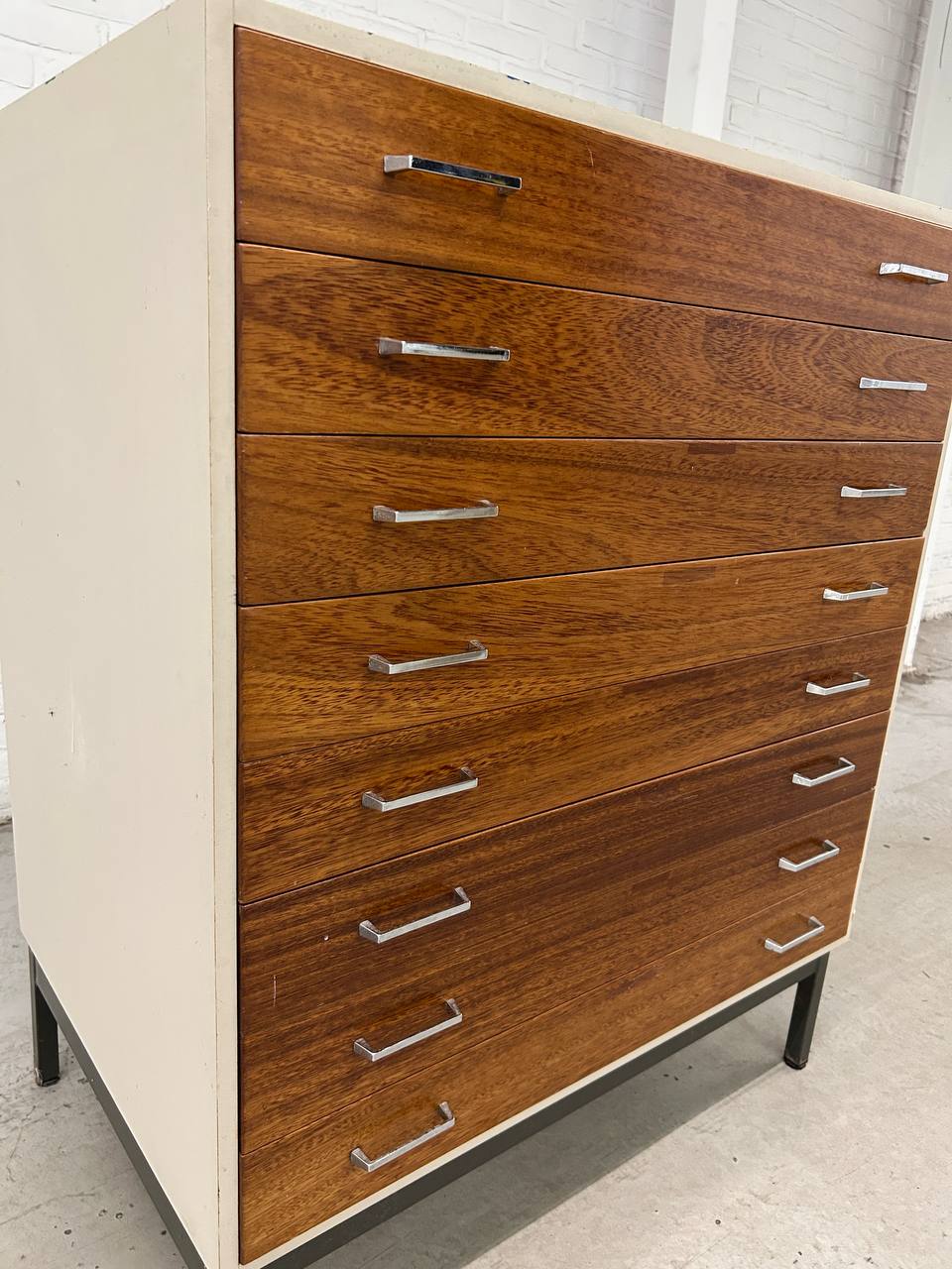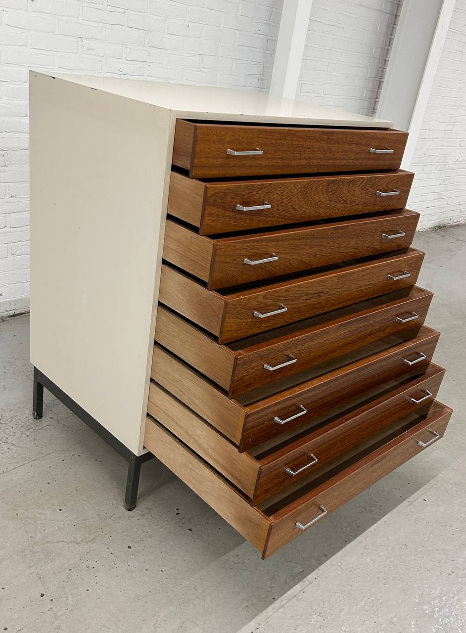 Originele vintage papierkast /ladekast afkomstig uit een school. Deze unieke schoolkast is voorzien van maar liefst 8 diepe lades. Ideaal om je papierwerk in op te bergen. Ook bruikbaar als knutselkast of archiefkast. Deze retro industriële kast komt uit een voormalige basisschool waarbij hij gebruikt werd als tekenladenkast. Gezien de leeftijd in goede vintage staat. Het betreft tweedehands goederen welke voor verkoop geïnspecteerd kunnen worden.