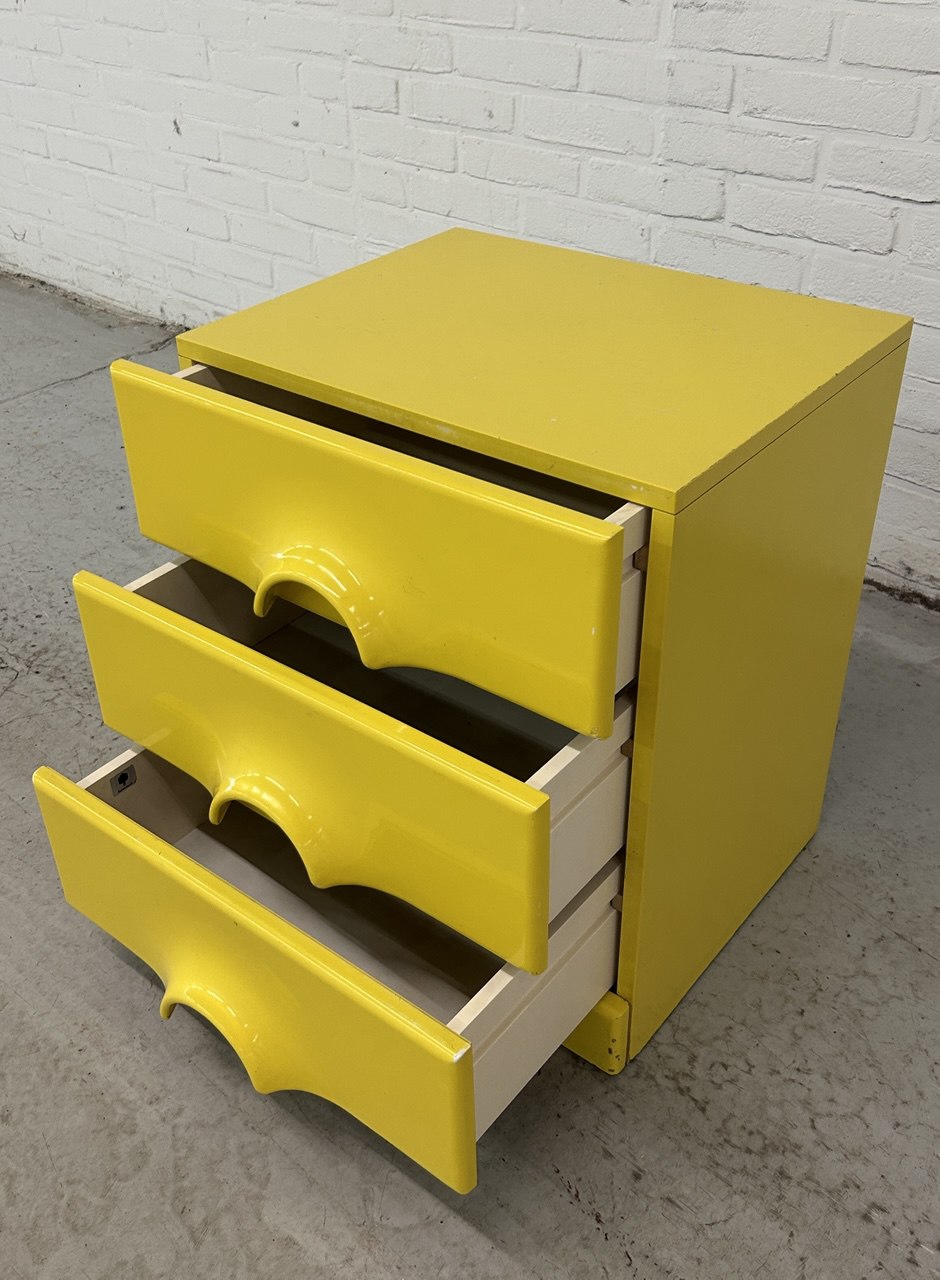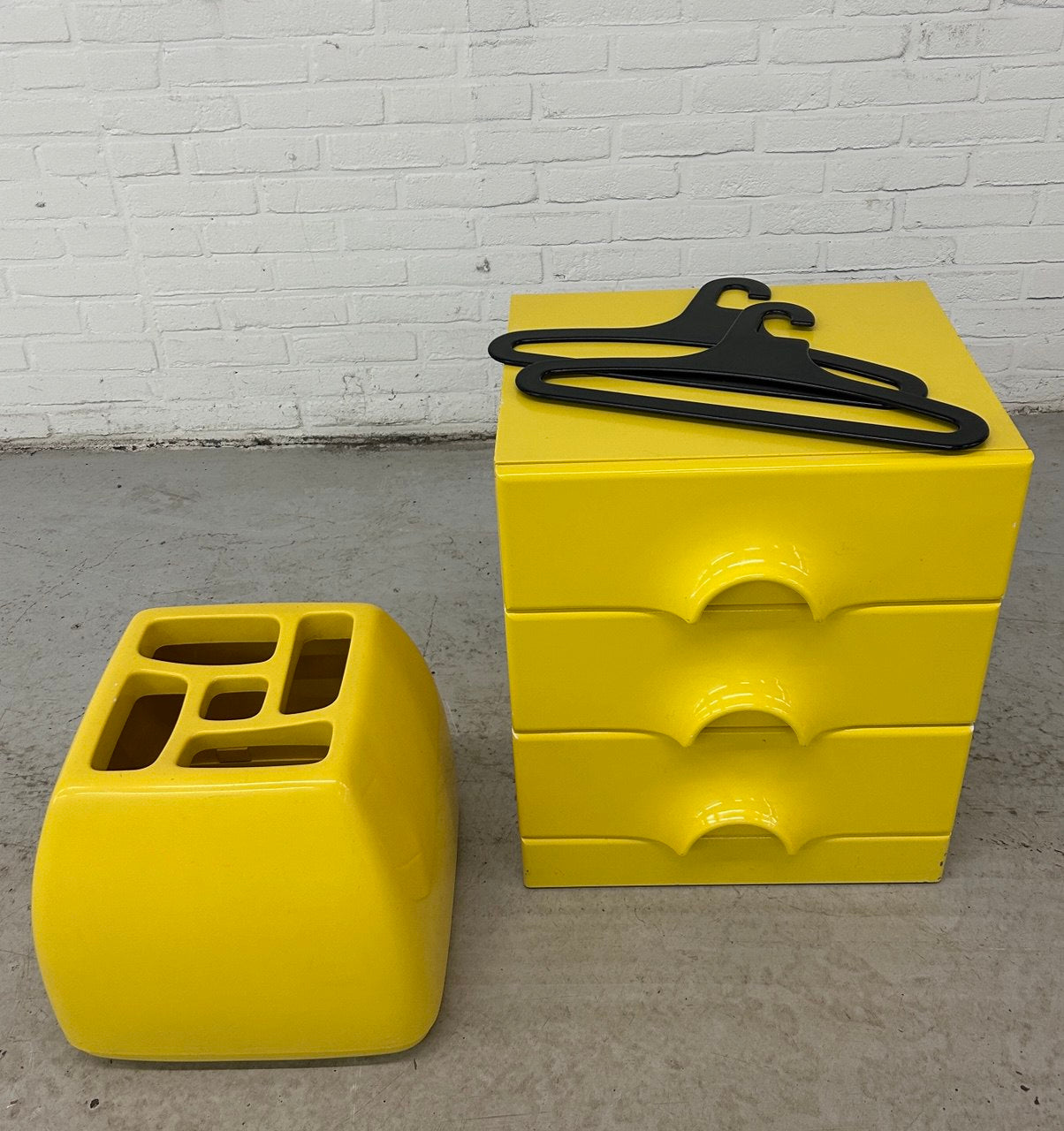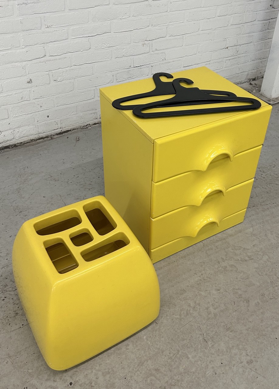 Origineel Space-Age Pop Art yellow Jaren 70 set bestaande uit een ladekast, een paraplubak en 2 kledinghangers model Quadro. Een ontwerp van Jurgen Lange Schönbuch. Dit Quadro model is zeldzaam en in originele staat. Dit meubel heeft gebruikerssporen door leeftijd en gebruik (zie foto’s). Het betreft tweedehands goederen welke voor verkoop geïnspecteerd kunnen worden.
