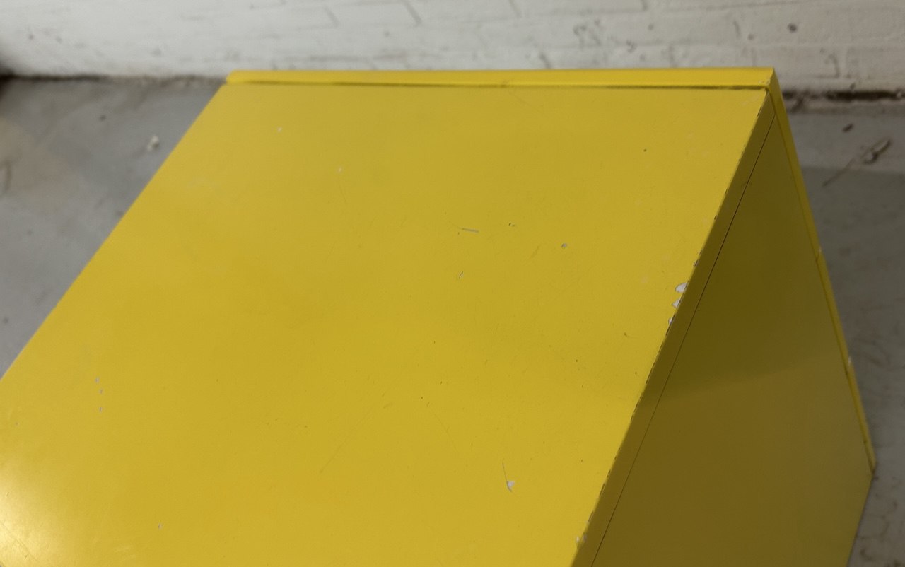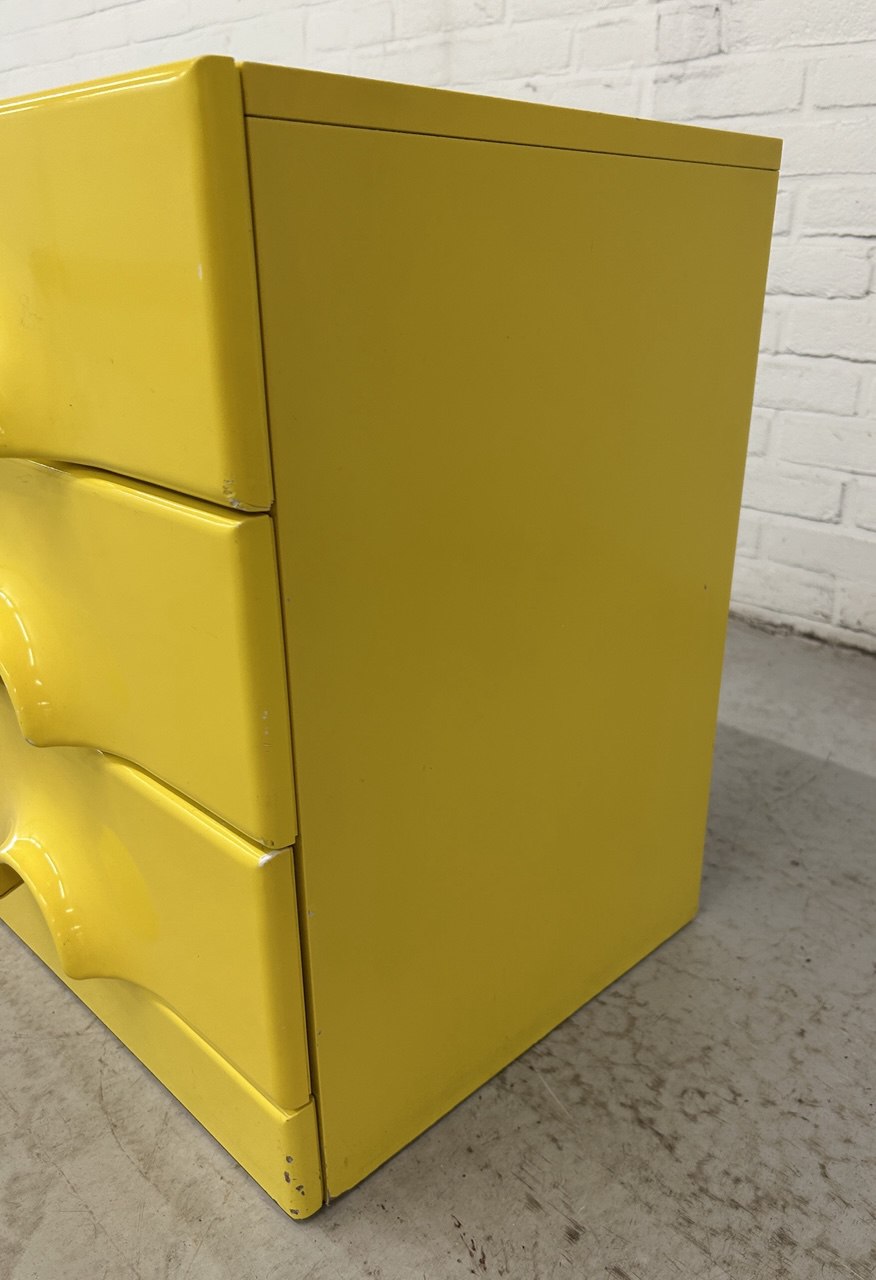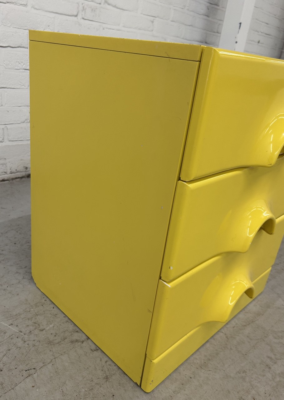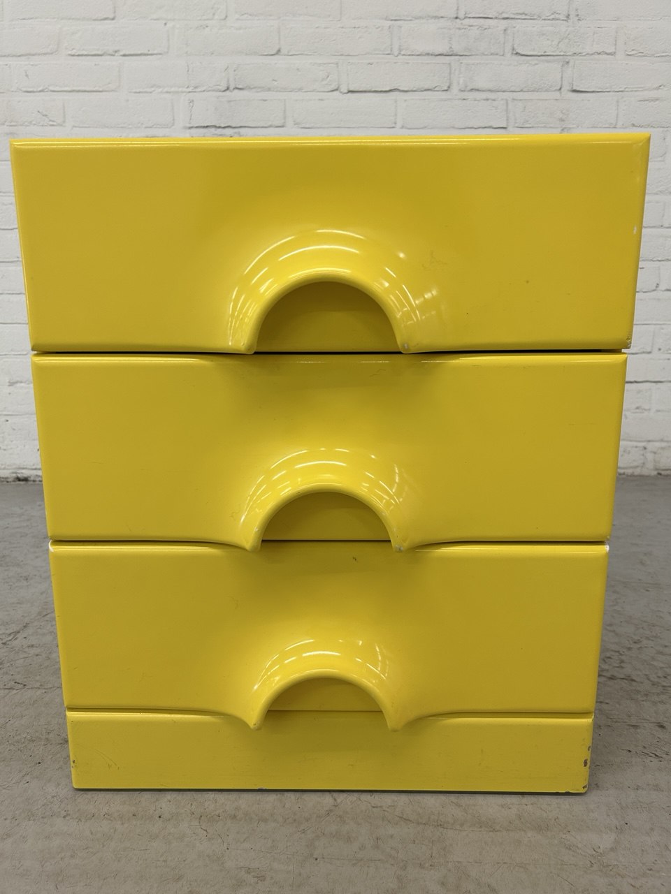 Origineel Space-Age Pop Art yellow Jaren 70 set bestaande uit een ladekast, een paraplubak en 2 kledinghangers model Quadro. Een ontwerp van Jurgen Lange Schönbuch. Dit Quadro model is zeldzaam en in originele staat. Dit meubel heeft gebruikerssporen door leeftijd en gebruik (zie foto’s). Het betreft tweedehands goederen welke voor verkoop geïnspecteerd kunnen worden.