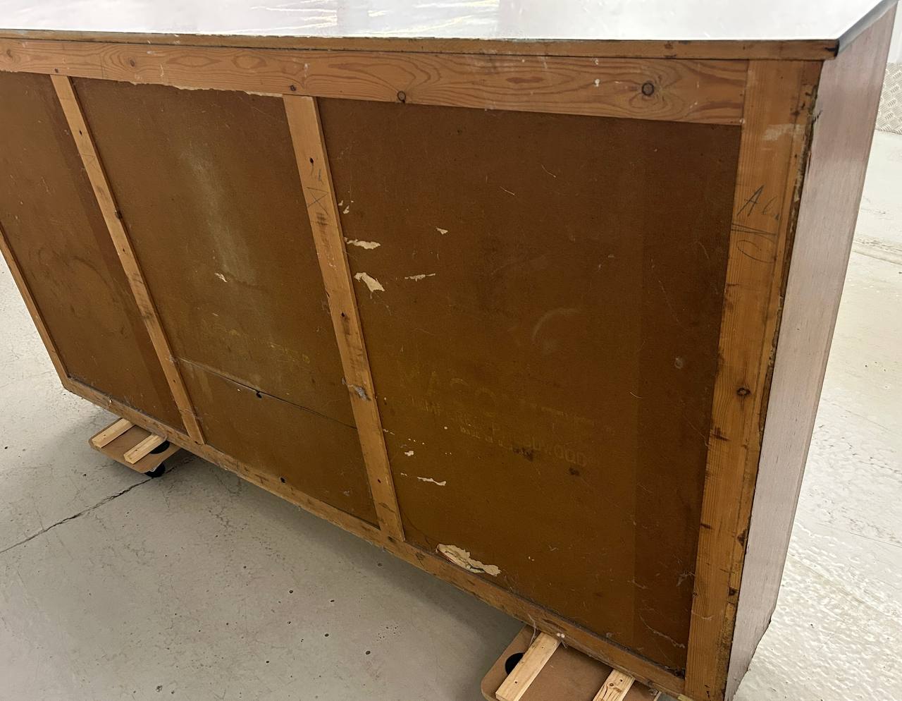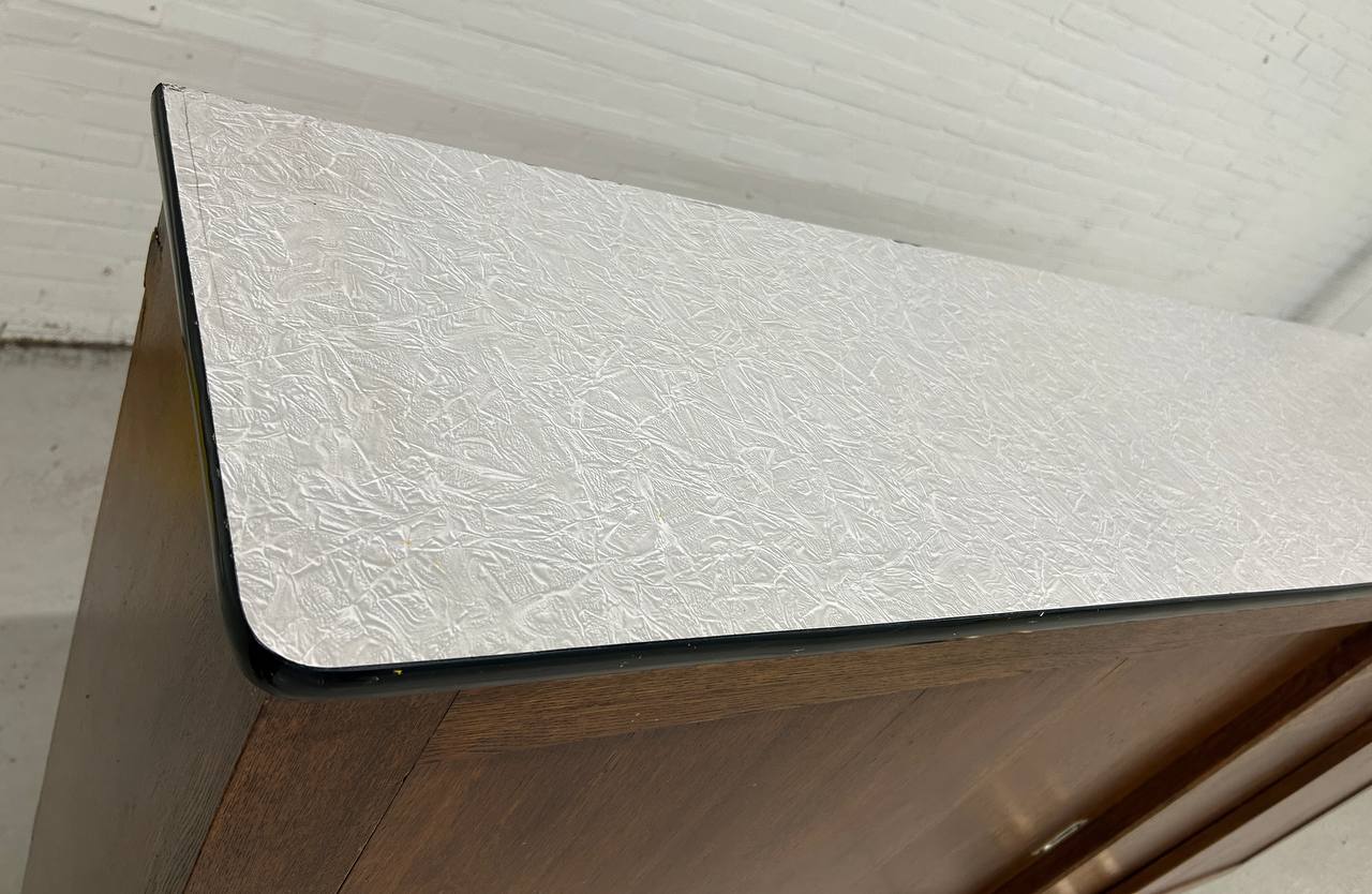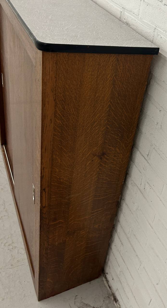 Originele vintage kast met schuifdeuren en formica blad afkomstig uit een school. Deze unieke schoolkast is groot maar heel ondiep en daarom ideaal voor opbergruimte in bijvoorbeeld een hal. Heel bijzonder formaat meubel en handig omdat het schuifdeuren heeft. Deze retro industriële kast komt uit een voormalige basisschool. Gezien de leeftijd in goede vintage staat met normale gebruikerssporen. Het betreft tweedehands goederen welke voor verkoop geïnspecteerd kunnen worden.