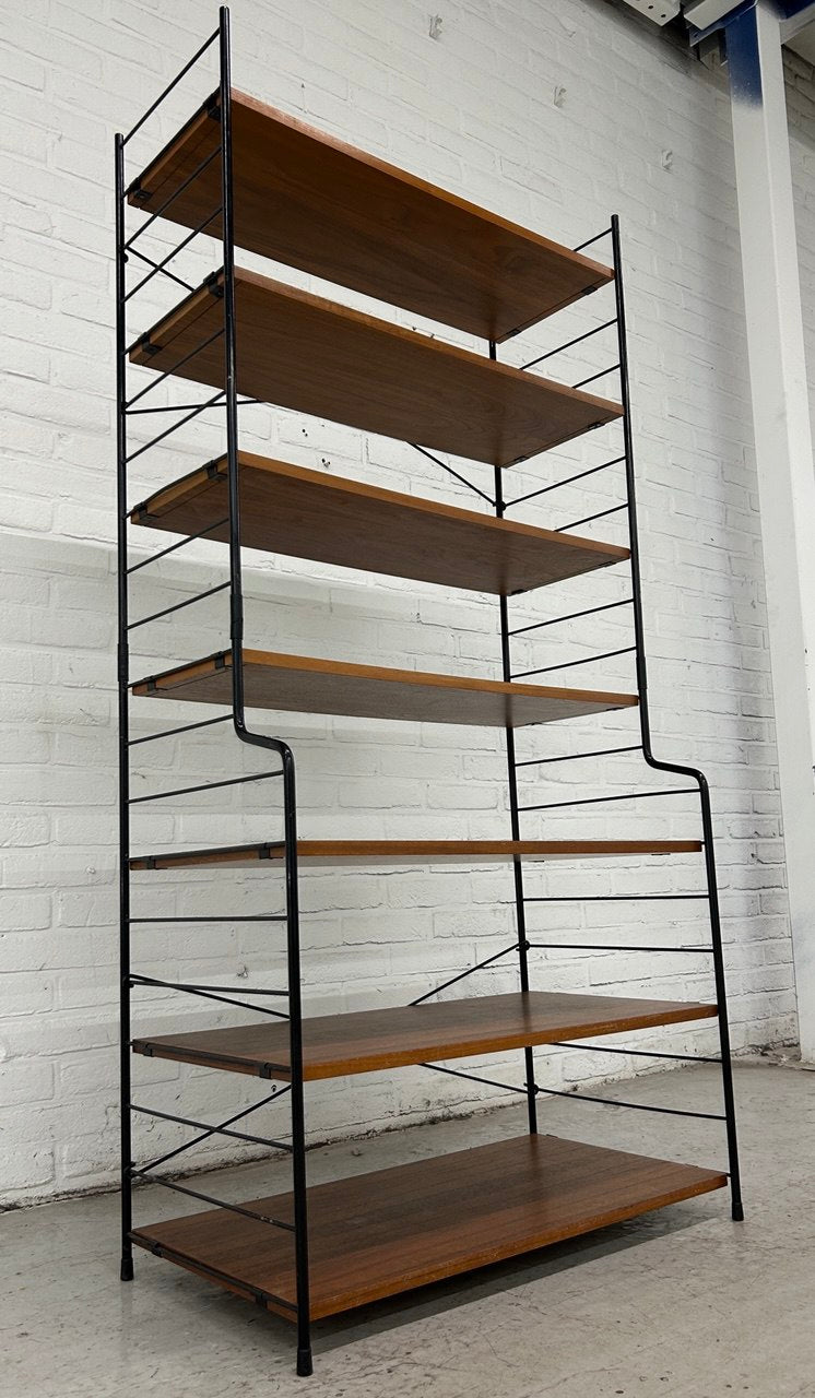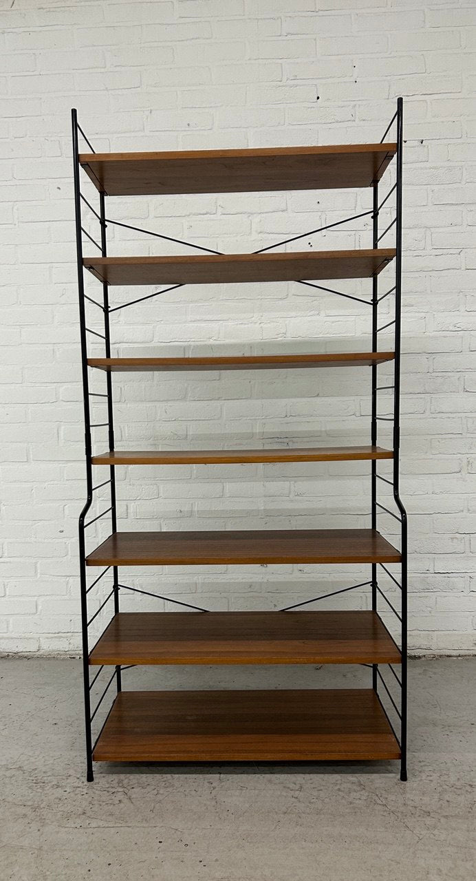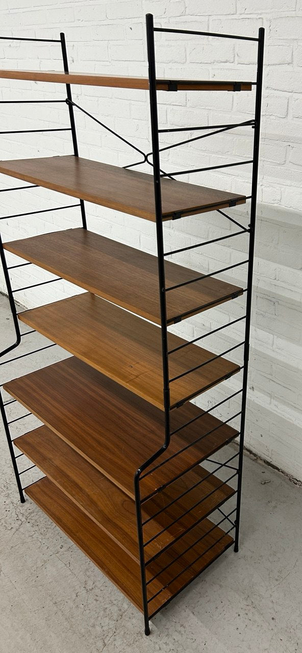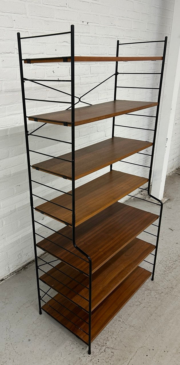 Midcentury design freestanding wall unit / wandsysteem. Geproduceerd door WHB (Germany). Naar eigen inzicht op te bouwen. Zwart metalen staanders en houten planken. Het boekenrek kenmerkt zich door zijn bijzondere flexibiliteit en eenvoudig uit te breiden in verticale en horizontale richting. Dit meubel heeft gebruikerssporen. 1 koppelstukje is kapot (zie laatste foto). Het betreft tweedehands goederen welke voor verkoop geïnspecteerd kunnen worden.