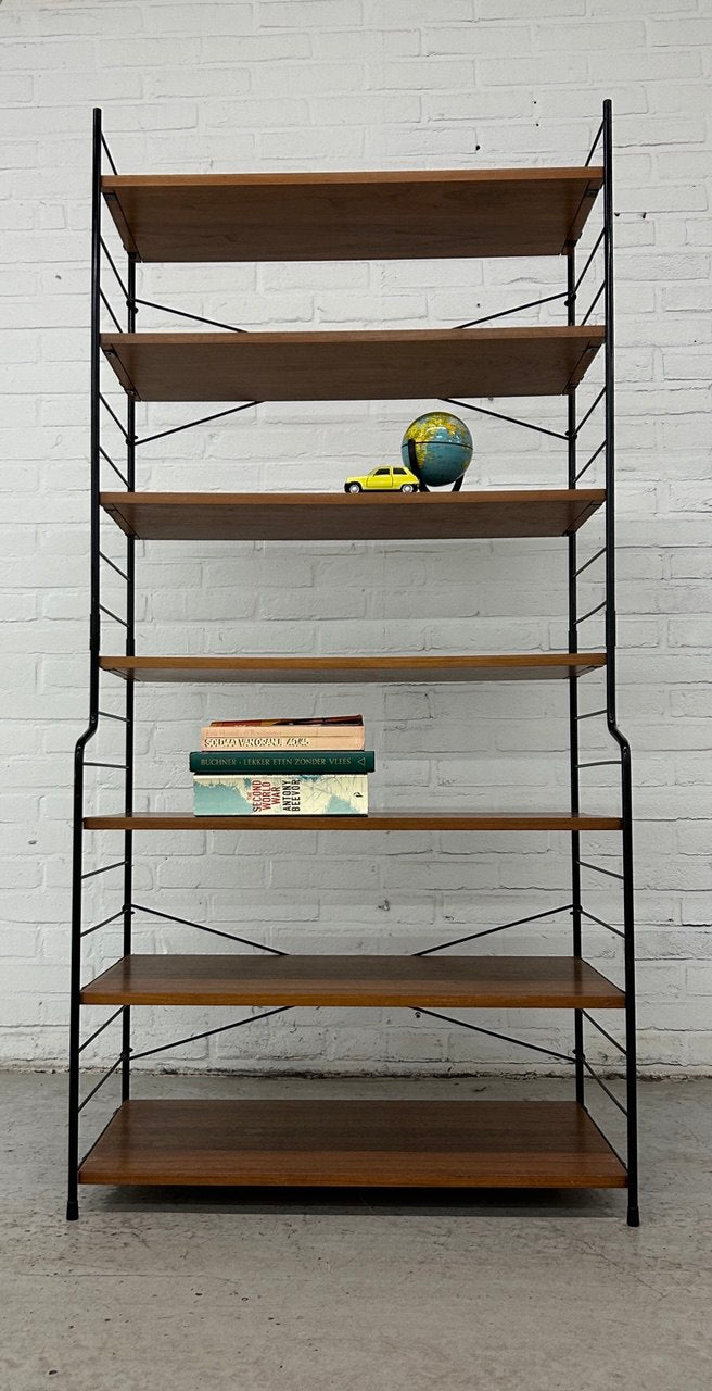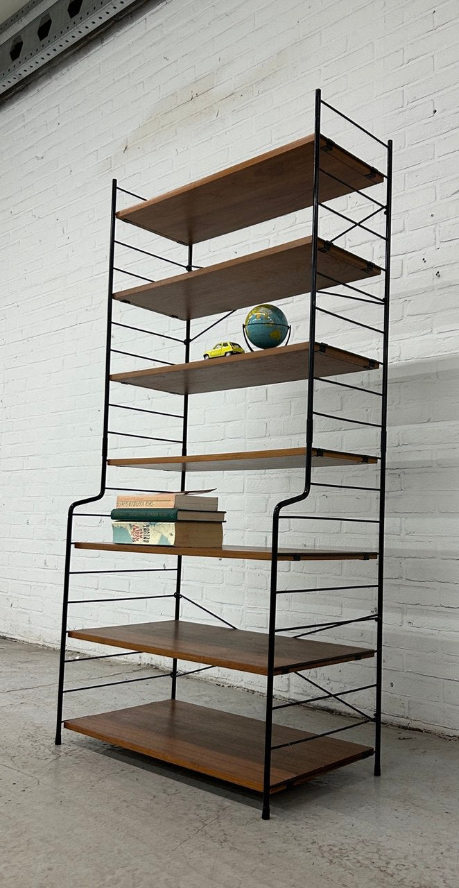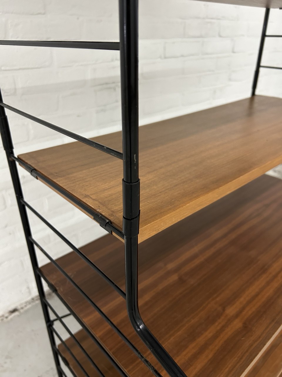 Midcentury design freestanding wall unit / wandsysteem. Geproduceerd door WHB (Germany). Naar eigen inzicht op te bouwen. Zwart metalen staanders en houten planken. Het boekenrek kenmerkt zich door zijn bijzondere flexibiliteit en eenvoudig uit te breiden in verticale en horizontale richting. Dit meubel heeft gebruikerssporen. 1 koppelstukje is kapot (zie laatste foto). Het betreft tweedehands goederen welke voor verkoop geïnspecteerd kunnen worden.
