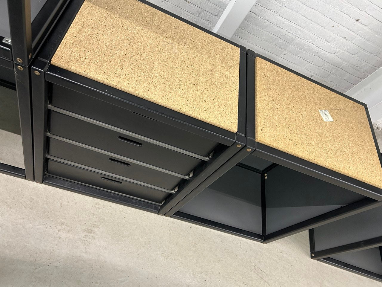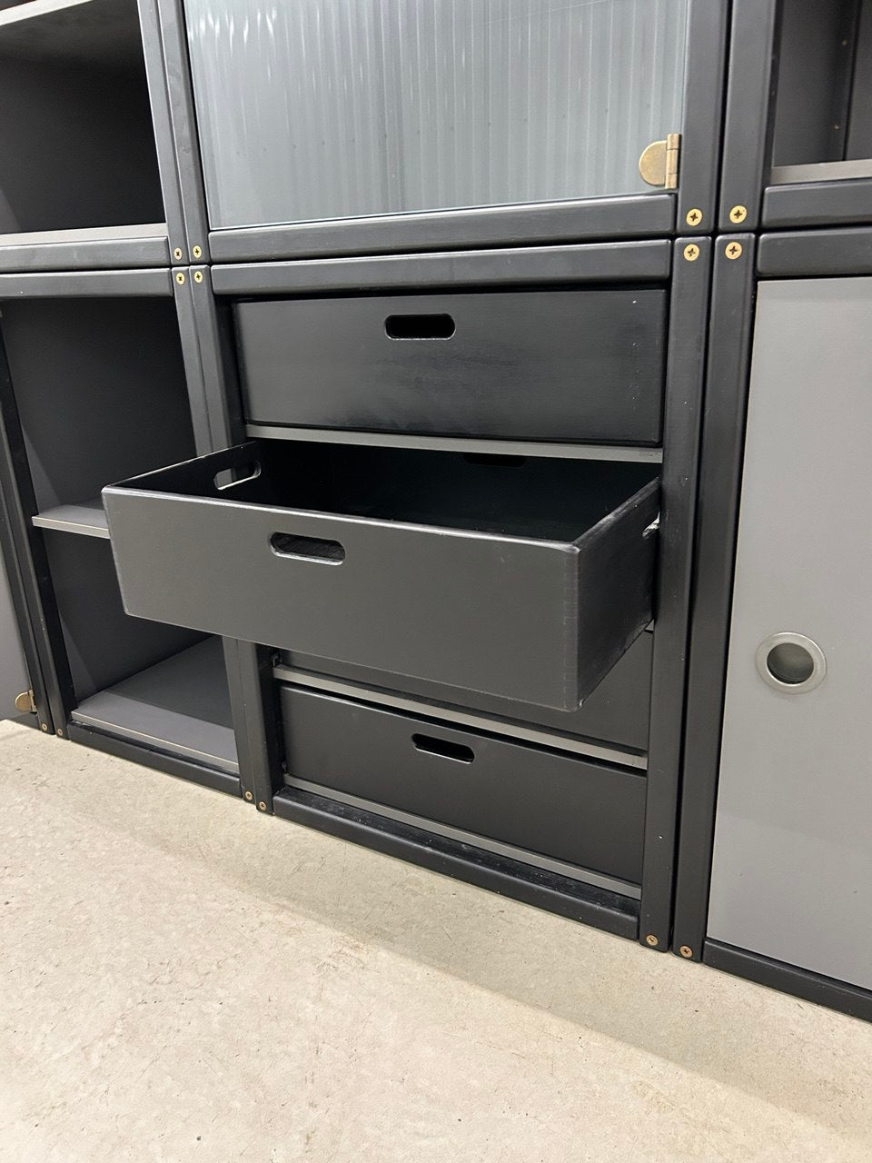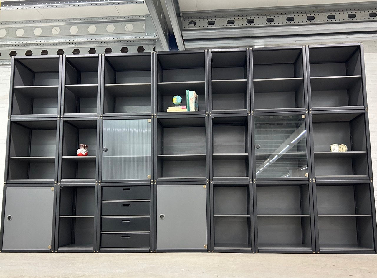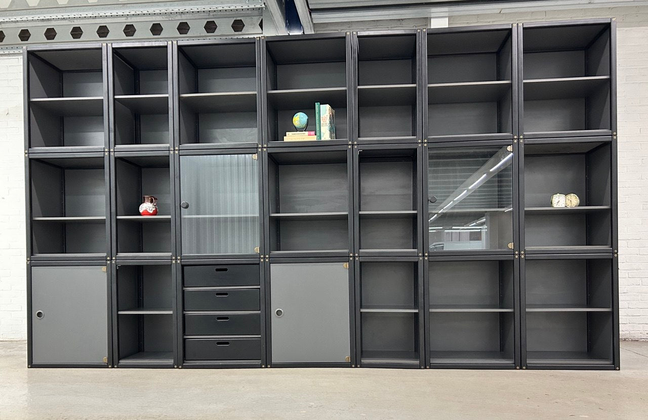 Uniek groot retro modulair wandsysteem. Deze Flötotto jaren 70 vondst bestaat uit maar liefst 21 kasten. Deze elementen zijn niet aan elkaar bevestigd en kunnen op alle mogelijke manieren worden neergezet. Zoals afgebeeld op onze foto’s is het 1 groot wandmeubel maar alles is mogelijk. Het is compleet met de originele planken die tussen de modules gelegd worden en nog extra planken. Zelfs de authentieke Flötotto magazines bij aanschaf van dit meubel zijn bewaard gebleven. Deze wandkast / roomdivider / dressoir / boekenkast / schoolkast / ladekast / archiefkast of hoe je het ook wilt gebruiken is uitgevoerd in antraciet met zwart.