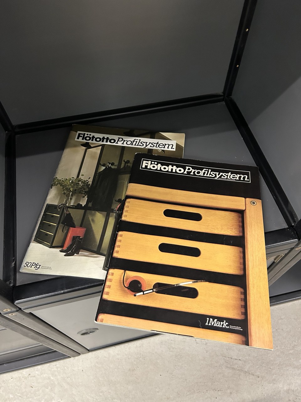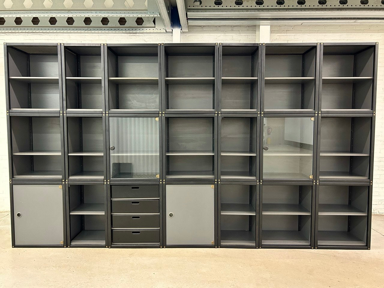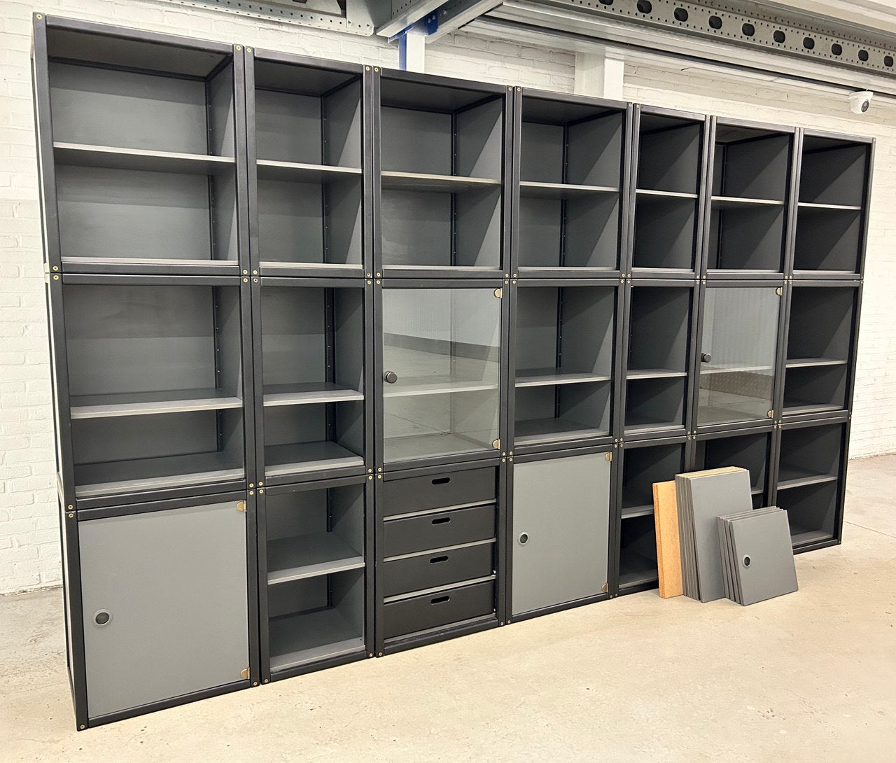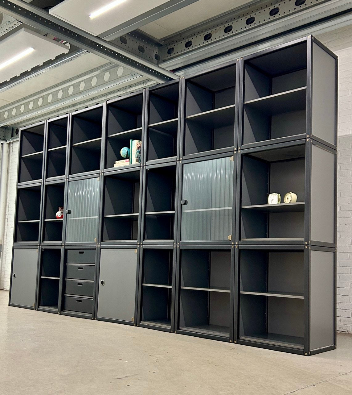 Uniek groot retro modulair wandsysteem. Deze Flötotto jaren 70 vondst bestaat uit maar liefst 21 kasten. Deze elementen zijn niet aan elkaar bevestigd en kunnen op alle mogelijke manieren worden neergezet. Zoals afgebeeld op onze foto’s is het 1 groot wandmeubel maar alles is mogelijk. Het is compleet met de originele planken die tussen de modules gelegd worden en nog extra planken. Zelfs de authentieke Flötotto magazines bij aanschaf van dit meubel zijn bewaard gebleven. Deze wandkast / roomdivider / dressoir / boekenkast / schoolkast / ladekast / archiefkast of hoe je het ook wilt gebruiken is uitgevoerd in antraciet met zwart.