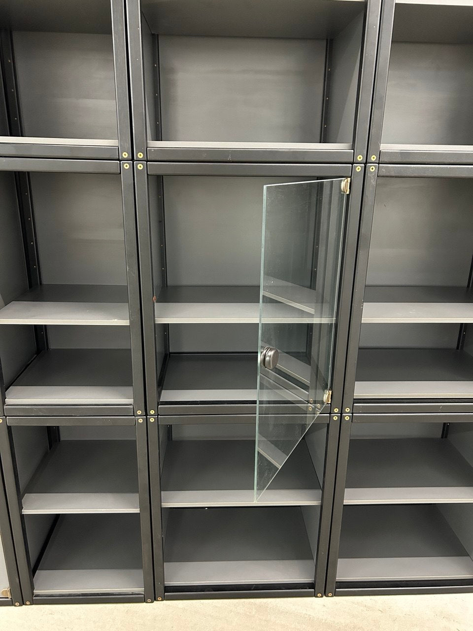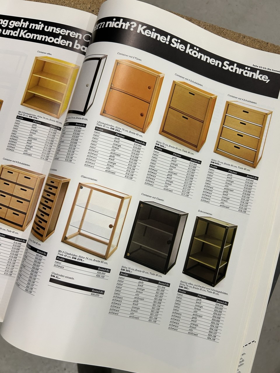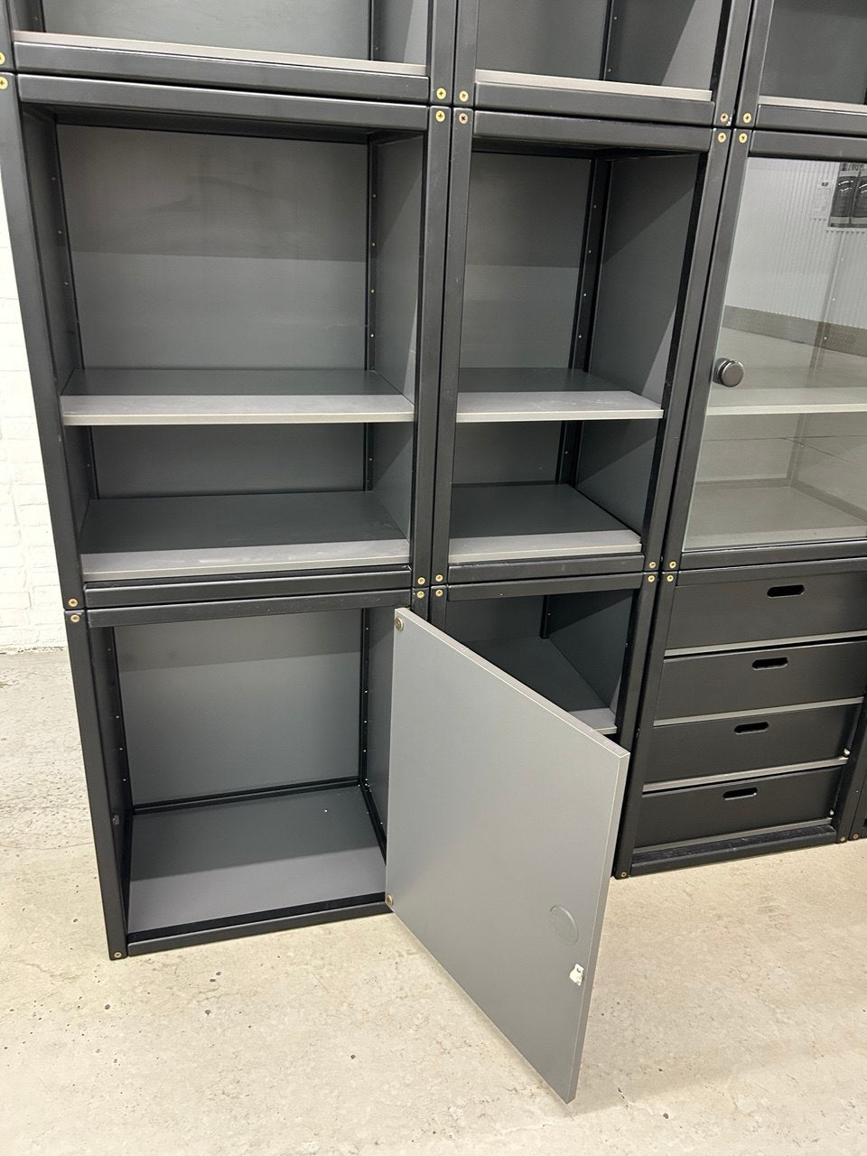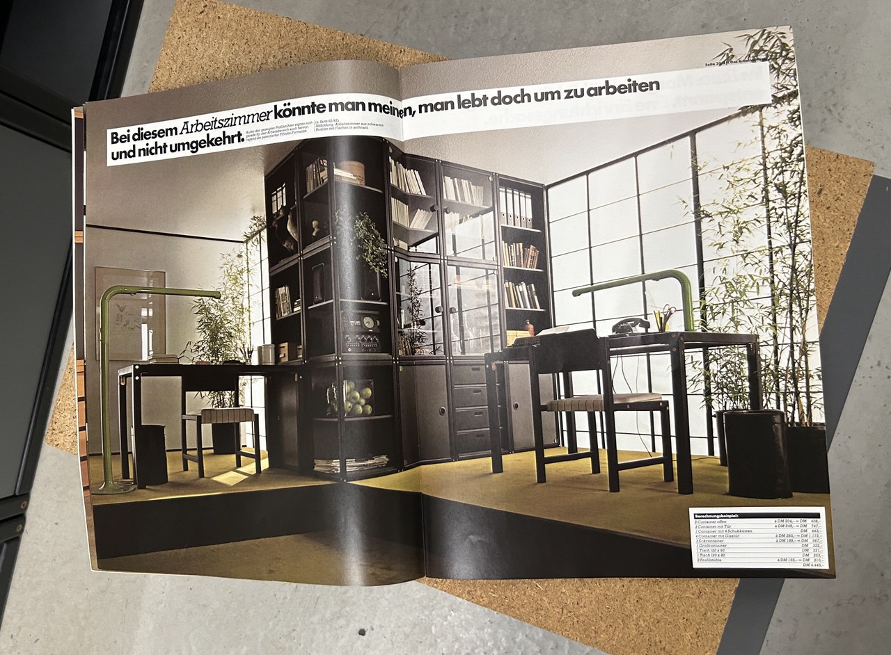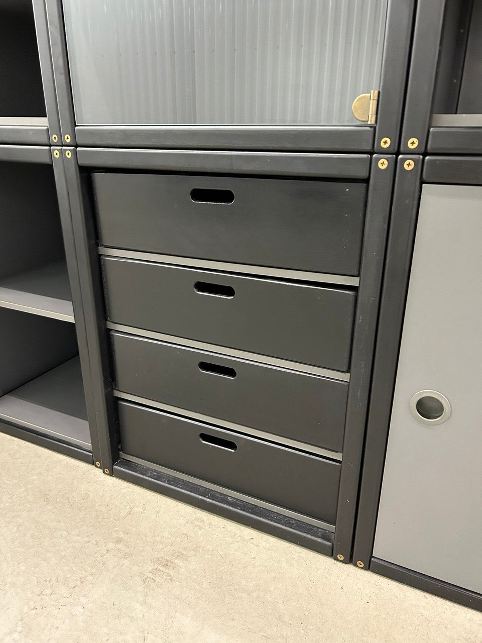 Uniek groot retro modulair wandsysteem. Deze Flötotto jaren 70 vondst bestaat uit maar liefst 21 kasten. Deze elementen zijn niet aan elkaar bevestigd en kunnen op alle mogelijke manieren worden neergezet. Zoals afgebeeld op onze foto’s is het 1 groot wandmeubel maar alles is mogelijk. Het is compleet met de originele planken die tussen de modules gelegd worden en nog extra planken. Zelfs de authentieke Flötotto magazines bij aanschaf van dit meubel zijn bewaard gebleven. Deze wandkast / roomdivider / dressoir / boekenkast / schoolkast / ladekast / archiefkast of hoe je het ook wilt gebruiken is uitgevoerd in antraciet met zwart.