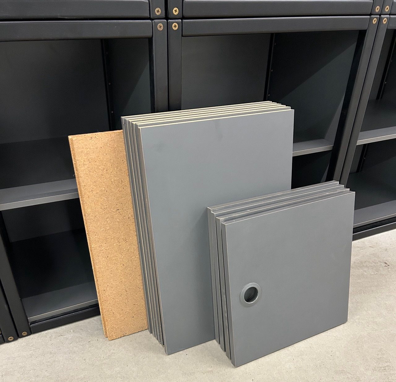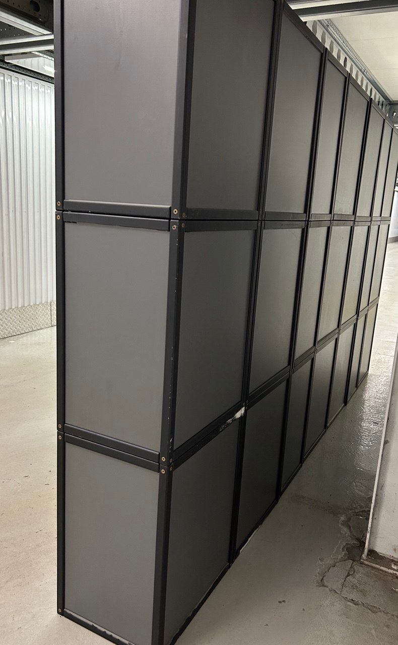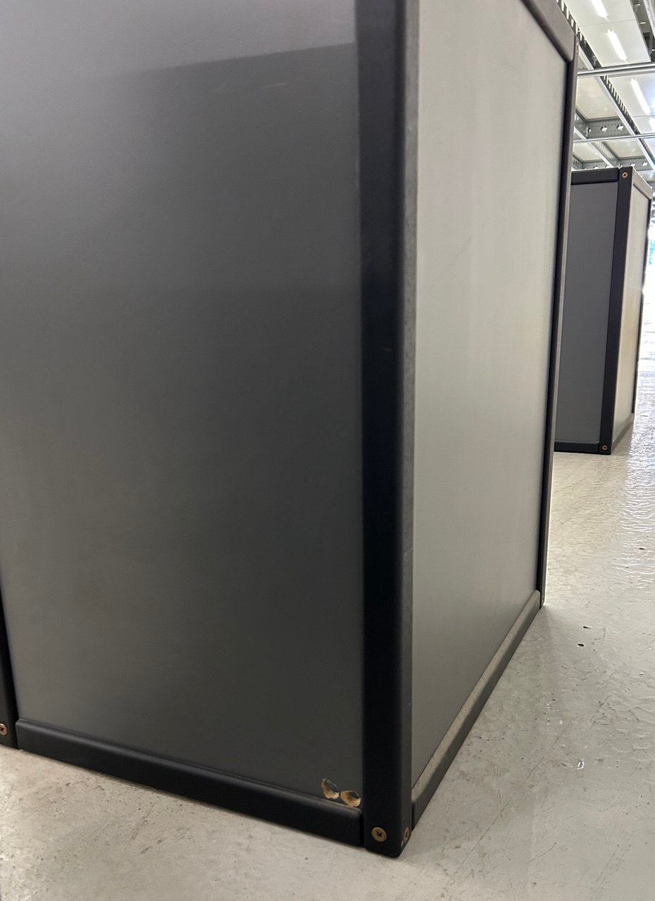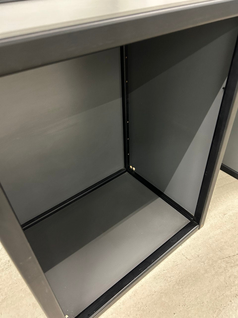 Uniek groot retro modulair wandsysteem. Deze Flötotto jaren 70 vondst bestaat uit maar liefst 21 kasten. Deze elementen zijn niet aan elkaar bevestigd en kunnen op alle mogelijke manieren worden neergezet. Zoals afgebeeld op onze foto’s is het 1 groot wandmeubel maar alles is mogelijk. Het is compleet met de originele planken die tussen de modules gelegd worden en nog extra planken. Zelfs de authentieke Flötotto magazines bij aanschaf van dit meubel zijn bewaard gebleven. Deze wandkast / roomdivider / dressoir / boekenkast / schoolkast / ladekast / archiefkast of hoe je het ook wilt gebruiken is uitgevoerd in antraciet met zwart.